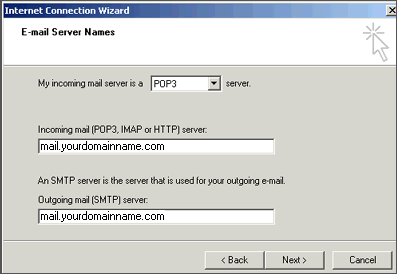 - For incoming and outgoing mail servers, enter mail.yourdomain.xyz (where yourdomain.xyz is your domain name and extension such as .com).