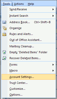 - In Outlook 2007, from the Tools menu, select Account Settings.